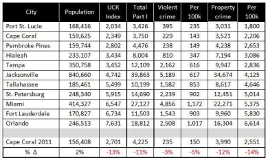 The city was ranked as the number one safest city for violent crime, meaning that people are least likely to fall victim to a crime of violence in Cape Coral than any other large city in the state. The Cape was also the second safest for property crime.